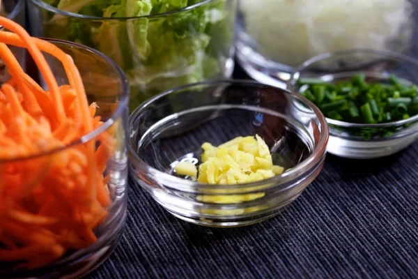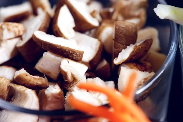 3. Add the mushrooms, cabbage, and carrots and cook until tender. Transfer the cooked vegetables to a large mixing bowl and allow to cool.
